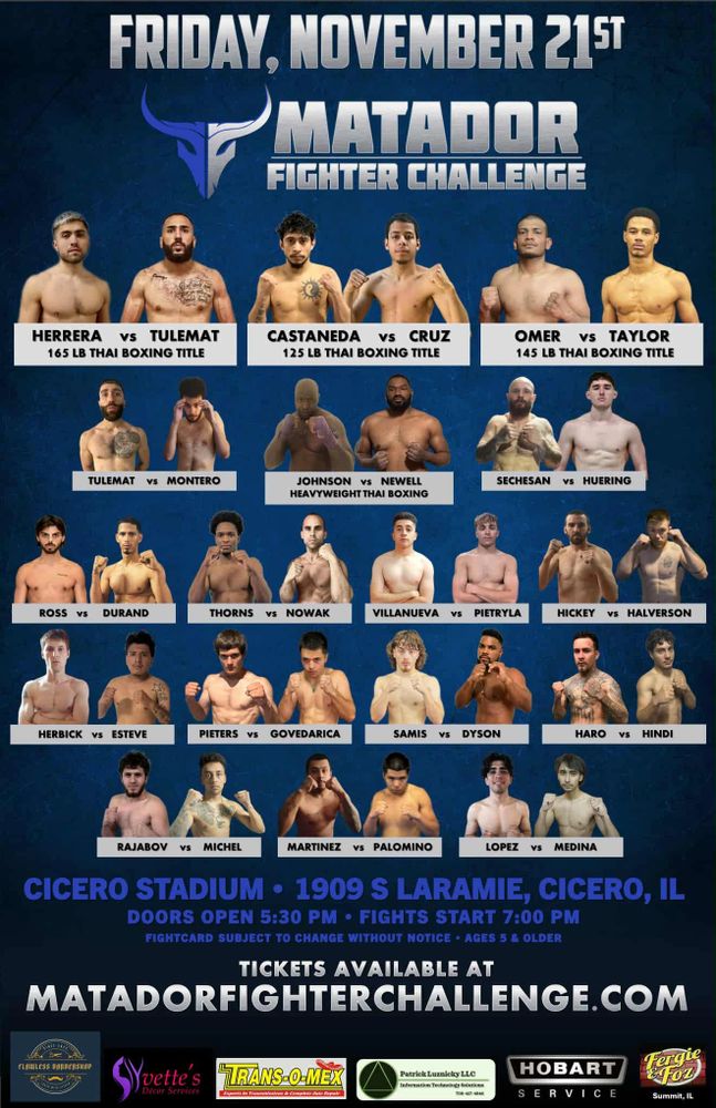 Get ready for an electrifying night of combat sports as the best fighters from the Chicago-land area step into the cage for an action-packed showdown! Matador Fighter Challenge brings you the ultimate MMA and Thai event, where local warriors will battle it out in high-stakes, high-intensity matches. Watch as they unleash their power, skill, and grit in a fierce competition for dominance.